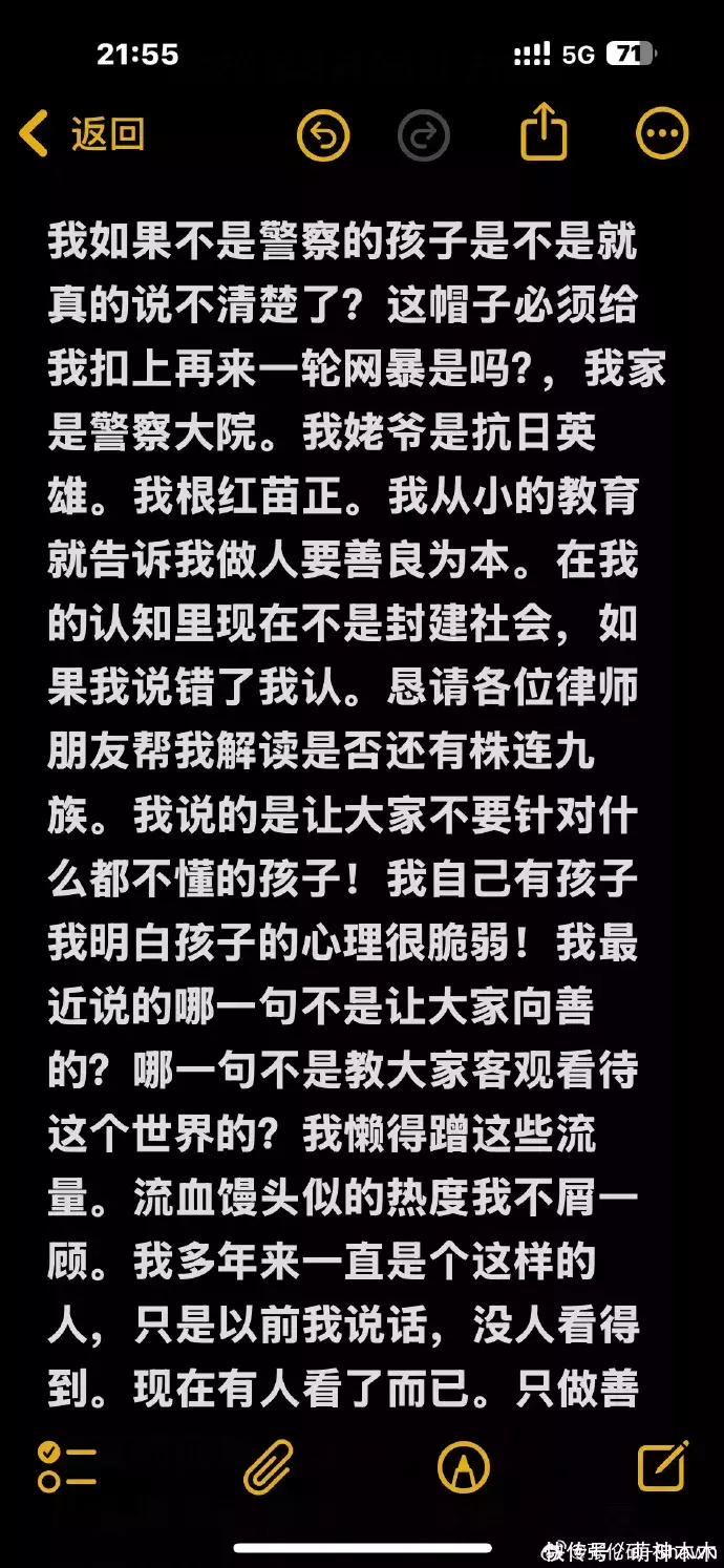 眼看着舆论声量骤增,张伦硕又发布长文称自己被误解,还用“封建社会”、“株连九族”等话术为自己辩解,同时用“警察大院”背景及“革命亲戚”为自己正名,强调自己根正苗红没有坏心思,批评网友在吃无辜孩子的“人血馒头”,不善良。