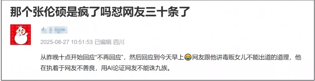 这条长文一出,与张伦硕争执的网友更多,他本人更是热血在线回怼30条,思维逻辑与网友不在同一条频道上,无视网友规劝“毒贩女儿出道的危害”,只是一味的“否认支持毒贩,指责网友不善良”。
