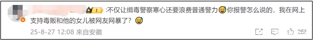 大部分网友对整件事情的看法则是无语至极,直接在评论区狂怼,有的斥责他浪费普通警力,让缉毒警察寒心,质问其怎么敢报警的。还有的点名他对不起自己的抗日英雄爷爷、警察父亲,怎么敢站在人民的对立面。