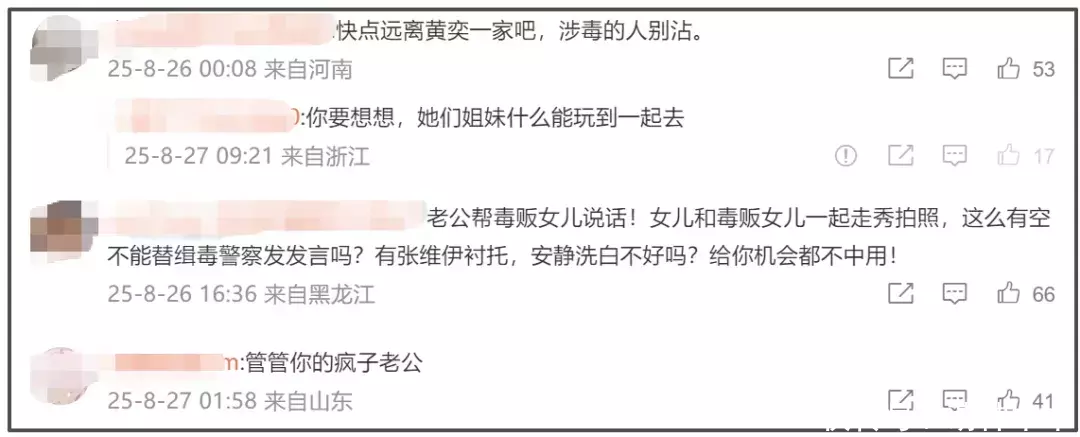 受张伦硕风波波及,老婆钟丽缇的评论区直接沦陷,不少网友劝钟丽缇快远离黄奕一家,不要挑战公众底线,还有的则表示两家一个德行,父亲支持毒贩女儿,钟丽缇女儿与黄奕女儿一起走秀拍照。
