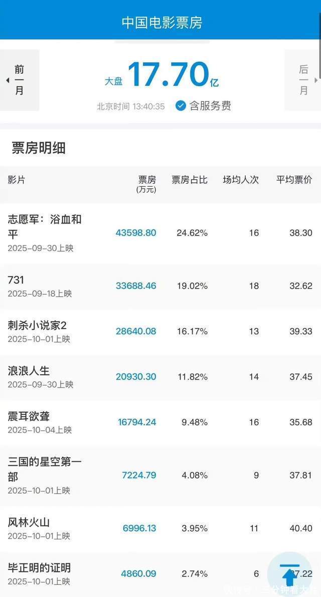 头部电影《志愿军:浴血和平》档期票房4.6亿,但同比去年冠军票房近乎腰斩;《刺杀小说家2》总票房2.8亿,IMAX特效厅占比超53%,却因剧情小众、戏份分配争议未达预期;老片《731》靠下沉市场四线占比35%长线逆袭,累计票房18.63亿,上映超15天仍居日榜前三。高口碑影片《震耳欲聋》豆瓣7.6分,但排片不足限制潜力;《毕正明的证明》豆瓣7.4分,票房仅4807万,成口碑与票房倒挂典型。同时,今年国庆平均票价降至37.8元。所有的片方都绞尽脑汁想要挖掘下沉市场期望创造什么奇迹,却最后丢了西瓜也丢了芝麻,不考虑青年观众和一二线城市的人士,最后电影市场无人问津。