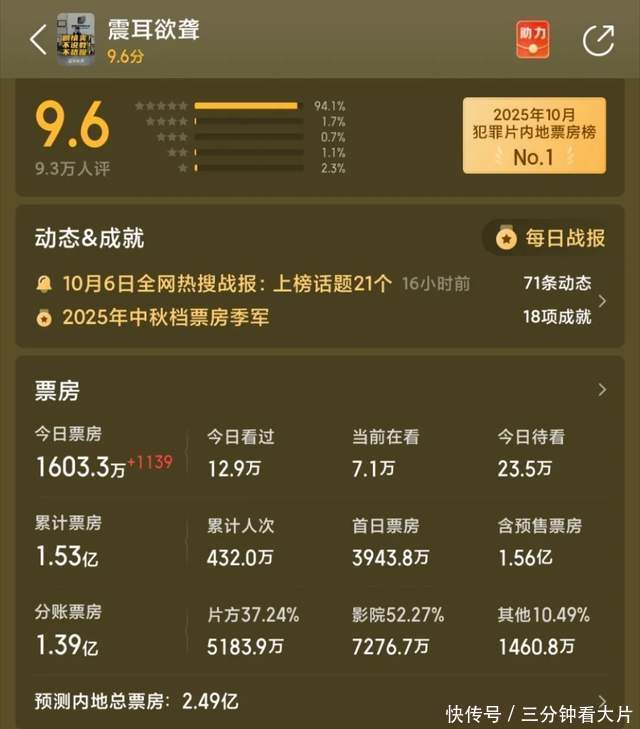 今年的国庆档表现就是很混乱,像《浪浪人生》有点像是之前的喜剧电影黑马既视感,但又不忘记还要掺杂原生家庭闽南文化特色,搞得不伦不类。《震耳欲聋》又想更年轻人贴近走口碑线,又想在下沉市场里面找到社会共鸣,然后两头没讨好,再加上上映时间和排片不利导致了票房差强人意。总而言之,拍电影的就是想着既要又要,可既做不到,又做不到。最后电影越来越差,让人们去电影院的动力也越来越小。