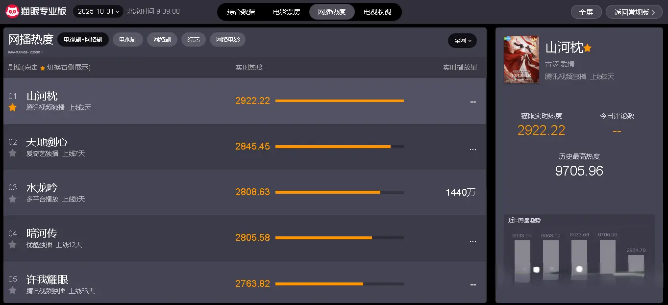 截止10月31日上午9时09分,从“猫眼专业版”实时数据显示可知,当前热播电视剧中,网播热度最高的五部剧分别如下:
